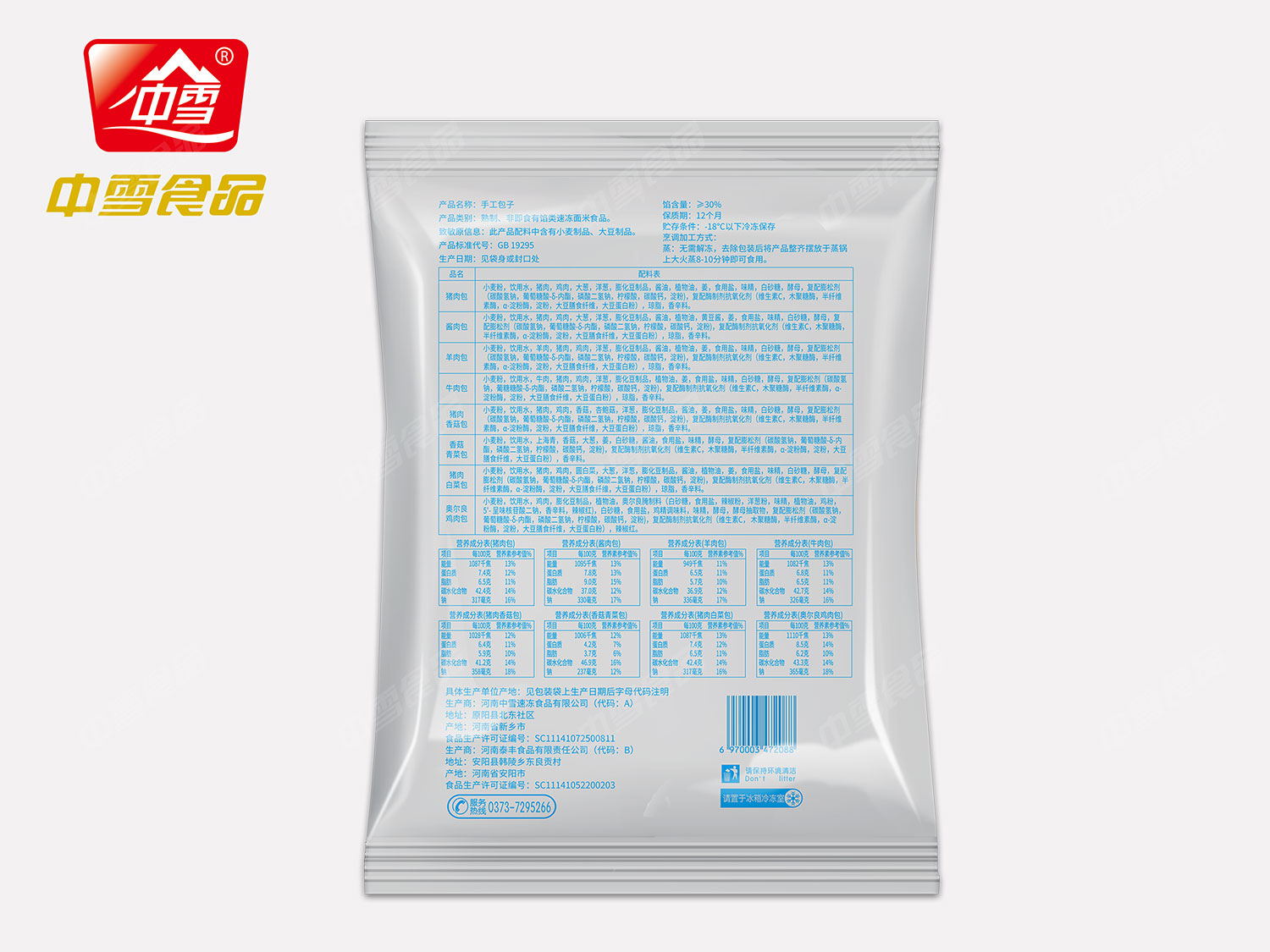 口味:猪肉、酱肉、羊肉、牛肉、猪肉香菇、香菇青菜、猪肉白菜、奥尔良鸡肉